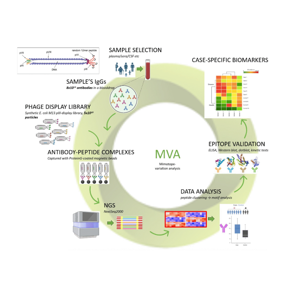 MVA is a next generation phage display method that enables the generation of both quantitative and qualitative antibody binding profiles. These profiles can be tailored to describe anything from individual molecules to entire populations, providing insights into the state of the immune system and its capacity to protect the body. This innovative tool interprets health-related data and is universally applicable across a range of diseases and health conditions. It empowers caregivers with a deeper understanding of immune functions, facilitating early prevention and enabling more precise treatment strategies.